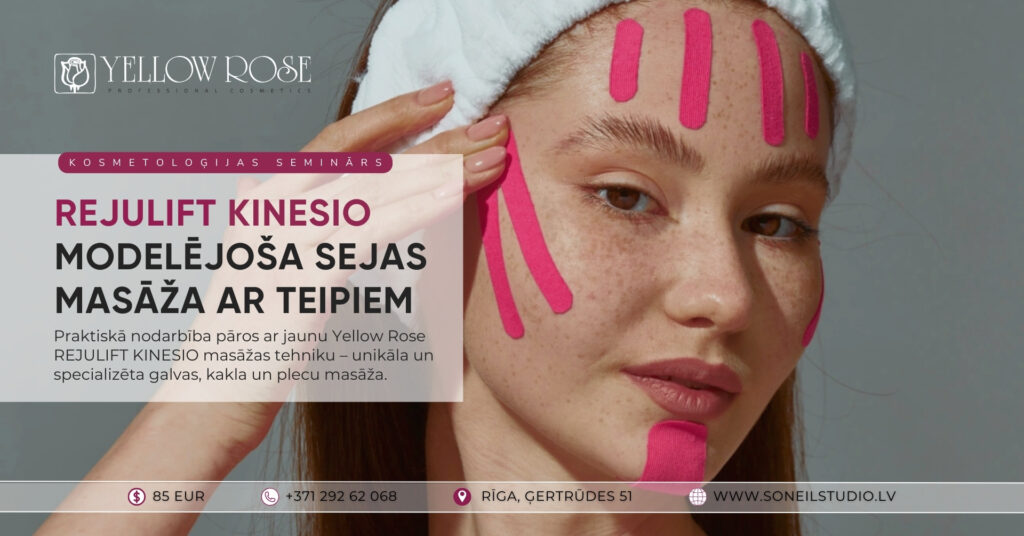 Praktiskā nodarbība pāros ar jaunu Yellow Rose REJULIFT KINESIO masāžas tehniku – unikāla un specializēta galvas, kakla un plecu masāža. Atjaunošana | Sejas konturēšana | Liftings.